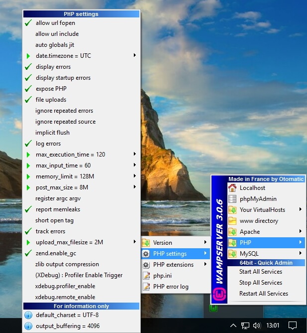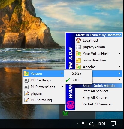 Out of the box, the WAMP server, once started will work just fine for normal operations, such as running WordPress. You can however tune and tweak all PHP, mySQl and apache settings, should you wish to do so. And the current version of WAMP even allows you to select the PHP version, either version 5.6.25 or 7.0.10. You can access all configuration settings via the (green) WAMP icon in your windows notification area. Note that the icon has to be green, as that indicates that the server is properly started, and all services are running.