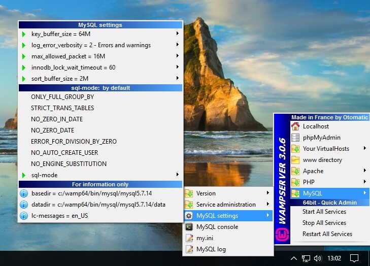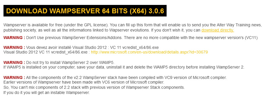 You can download WAMP via the WAMP site and select either the 32 or 64 bits version, depending on your PC’s processor. The current version of WAMP (Wampserver 3.0.6 64-bit x64 or 32-bit x86) contains: