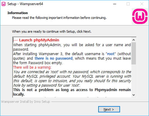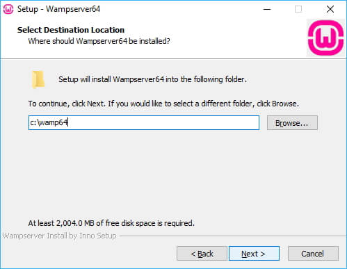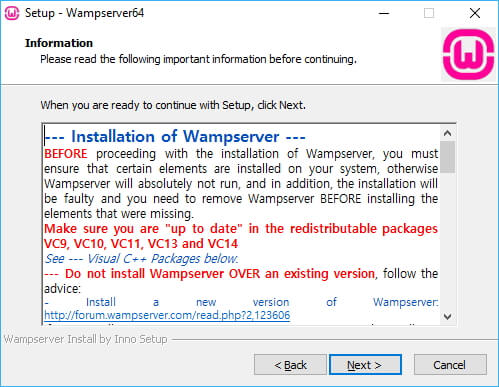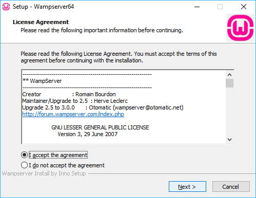 With these installed, you can start the installation by running the downloaded WAMP installer. The installer will take you through a couple of prompts:
