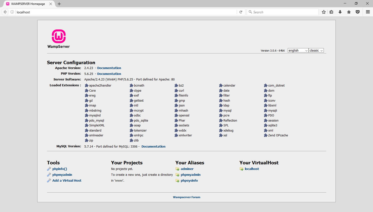 To test if WAMP is installed propely, navigate to your “server” at the address: http://localhost or the IP address 127.0.0.1. This will show the WAMP overview page, with information on the server, and links to various tools.