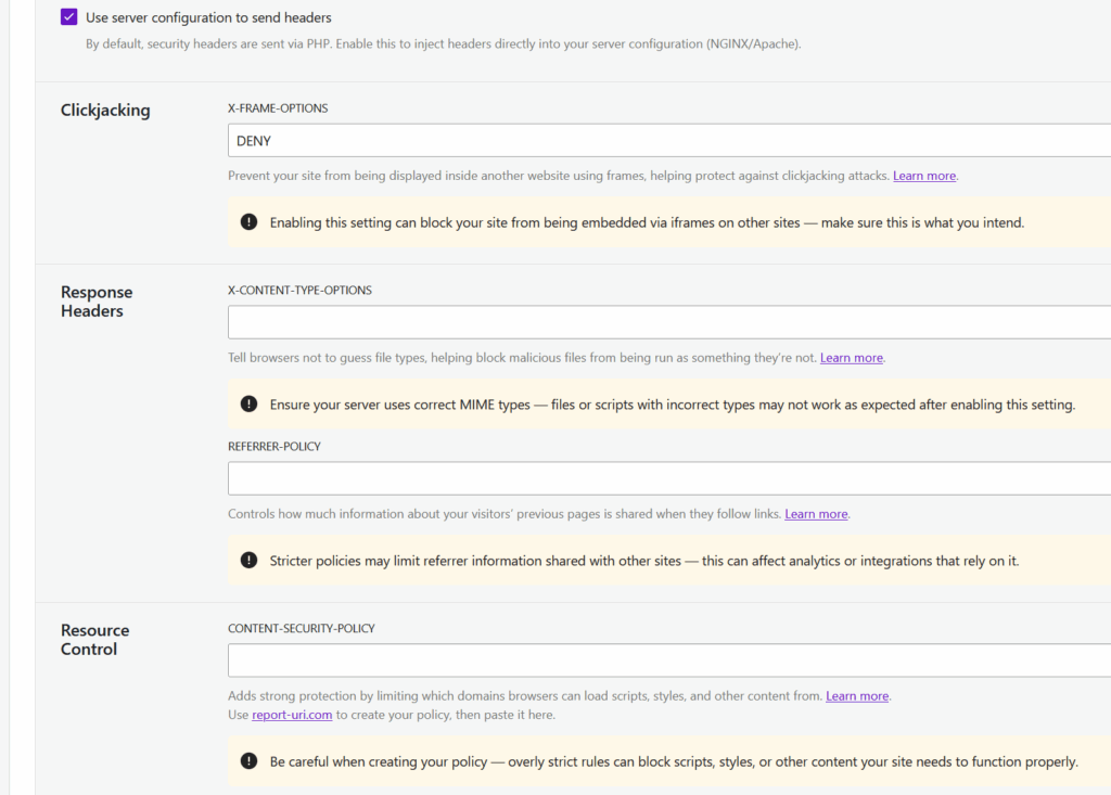 Note: These settings are powerful. We recommend reviewing the specific impact of each header before enabling them to ensure compatibility with your site’s existing functionality.