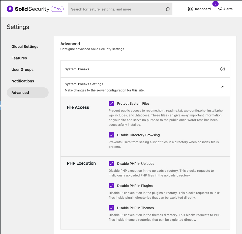 System Tweaks lets you configure low-level server-side settings to help block common exploited areas of a WordPress install.