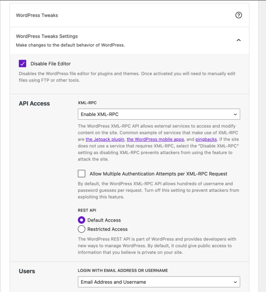The settings in WordPress Tweaks let you fine-tune WordPress functionalities such as disabling XML-RPC or limiting access to the REST API to minimize access to WordPress information.