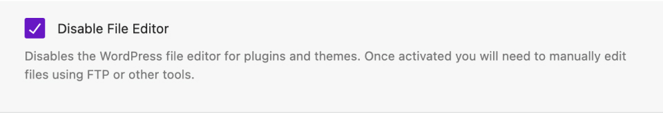 Once activated, you will need to manually edit theme and plugin files using FTP client, SSH, or your hosting file manager instead of the WordPress admin interface.