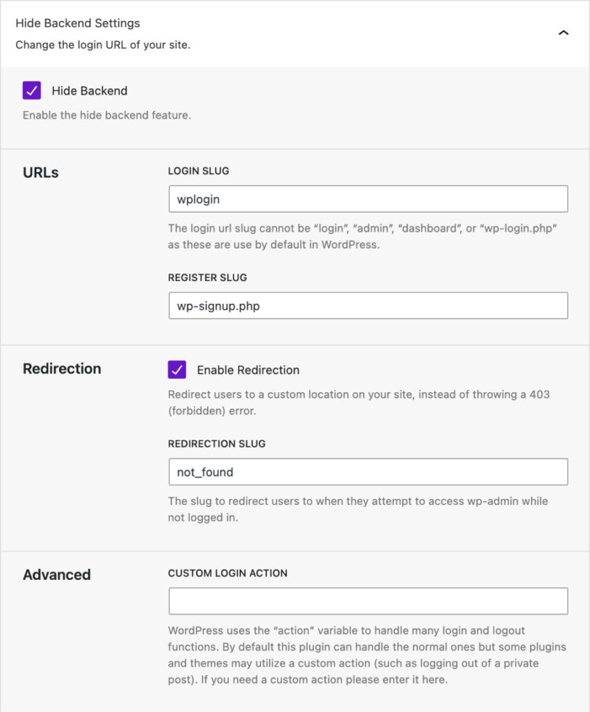 The Hide Backend feature allows for hiding the login page (wp-login.php, wp-admin, admin, and login), making it harder to find by automated attacks and making it easier for users unfamiliar with the WordPress platform.
