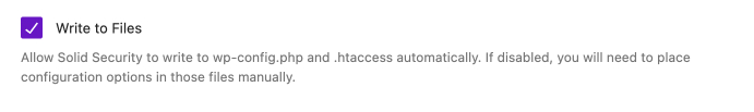 The write to files setting gives Solid Security the ability to write to your wp-config.php and .htaccess files.