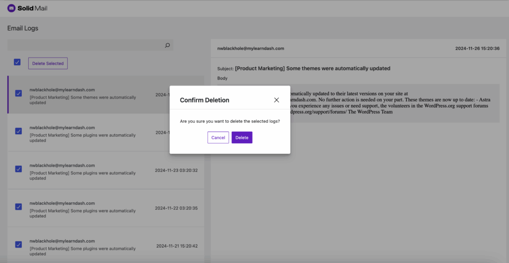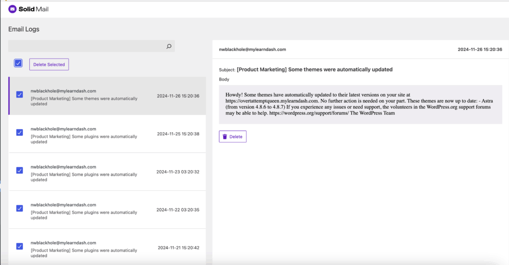 - Solid Mail 2.1.0 fixes an anomaly with email logging for WordPress sites using multisite configuration. Emails are being sent, but the email logs were not displaying deliverability details. This has been fixed.