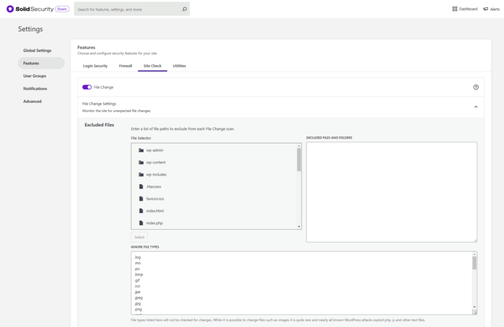 • You can choose to include or exclude files and directories scanned. I typically suggest excluding files with known processes to help quiet the white noise. An example of this would be caching files, backup directories and the .htaccess file. Of course, this is personal preference.