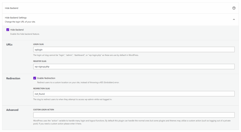 The Hide Backend feature allows you to change your login slug. Changing your WordPress admin URL adds a good extra layer of security, but it should not take place of Two-Factor and Strong Passwords. This feature is on the Advanced settings page due to its possibility of conflicting with other plugins and themes.