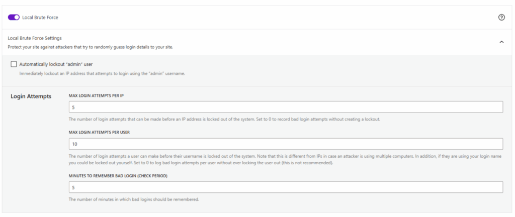 • You can choose to automatically lock out a user trying to log in with the username “admin.” If you don’t have a user on your site with this username, you should enable this feature.