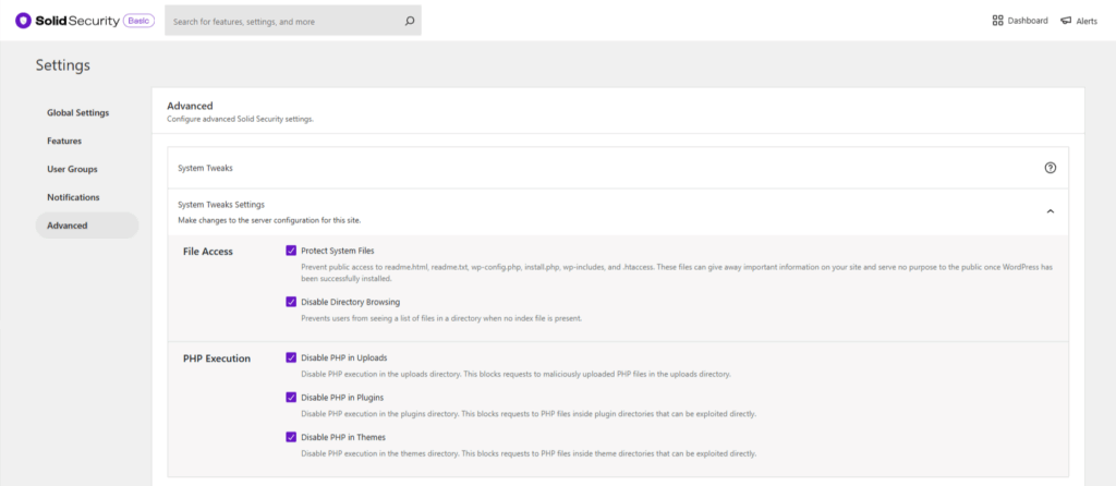 • Disable PHP in Uploads – This does not affect functionality. It prevents outside sources from executing potentially malicious scripts.