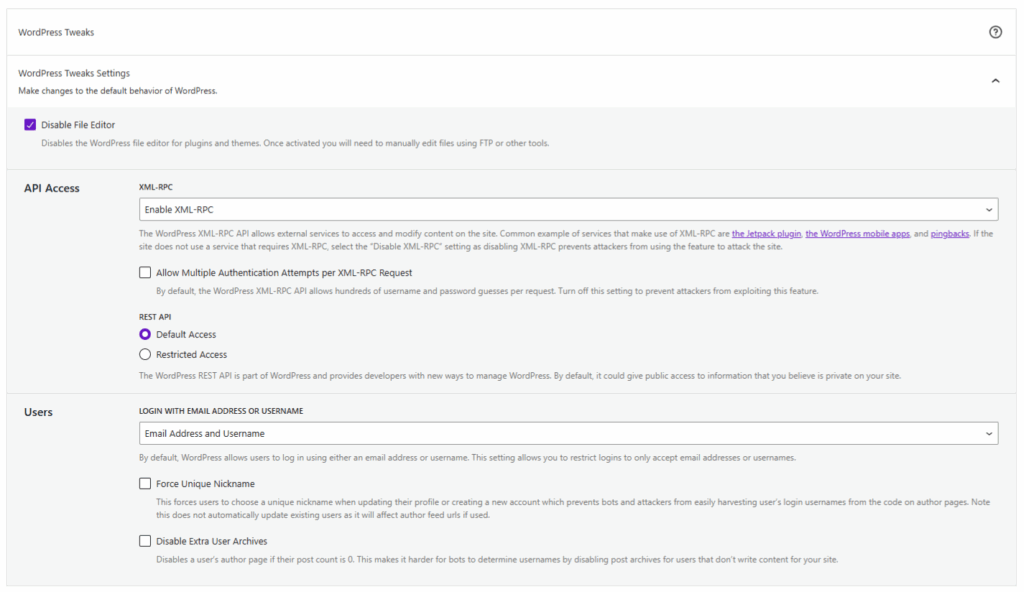 • File Editor – Enabling this disables the File Editor limiting editing the theme and plugins to only those who have direct access to the server.