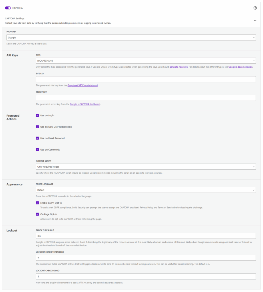 • With reCAPTCHA, you can add an extra layer of defense to your login page, registration and comments. You can choose between V2 or V3, which is the one most of us are familiar with, or the new Invisible reCAPTCHA that doesn’t even require a user to check a box.