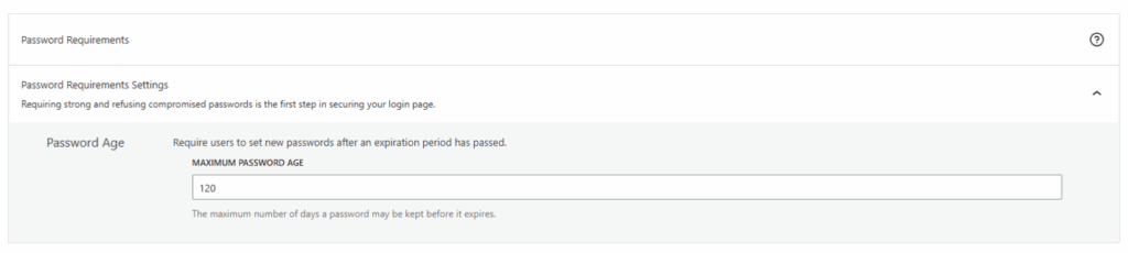 • Password Age: Require users to set new passwords after an expiration period has passed.