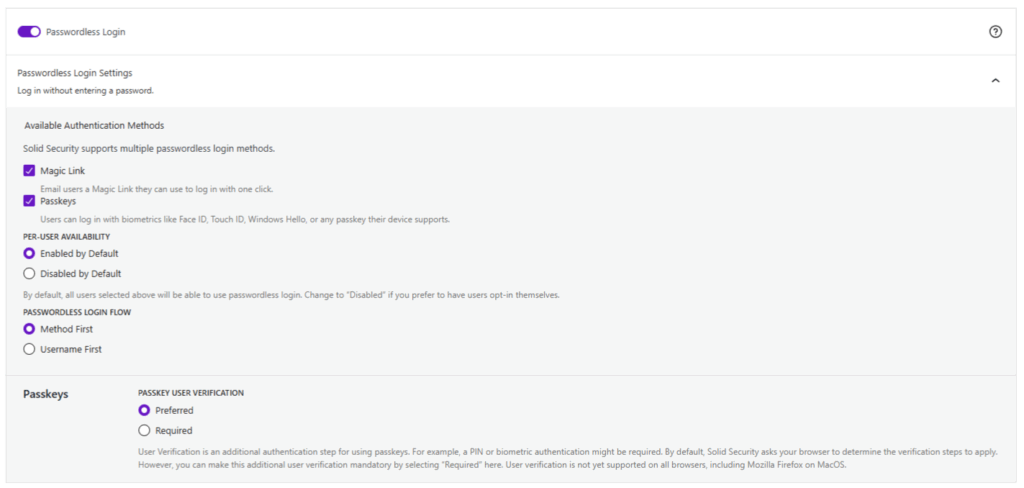 You can choose whether the per-user availability is enable or disabled by default. You can also choose the passwordless login flow: method or username first. Choose preferred or required for Passkey user verification.