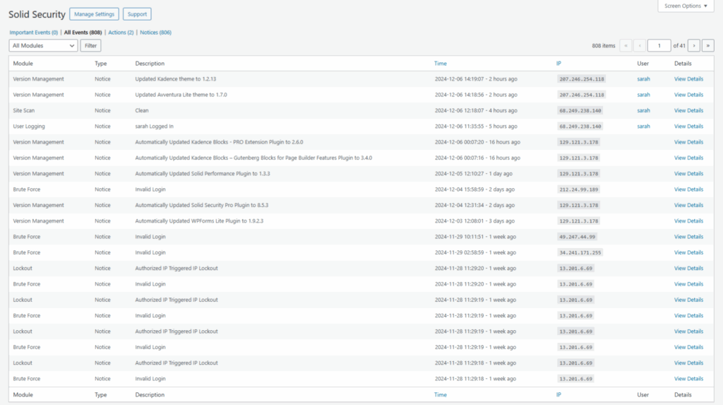 The Solid Security Logs gives you an overview of all logged actions on the site. The All Logged Data section gives you an overview of all actions.