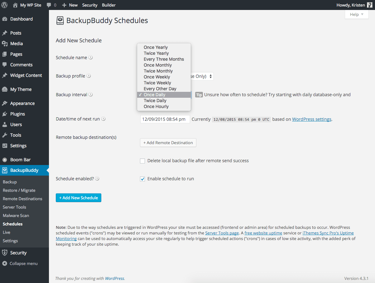 WordPress doesn’t have a built-in backup solution. You’ll need to use a WordPress backup plugin to backup your site’s database and files. This WordPress checklist is specific to BackupBuddy.