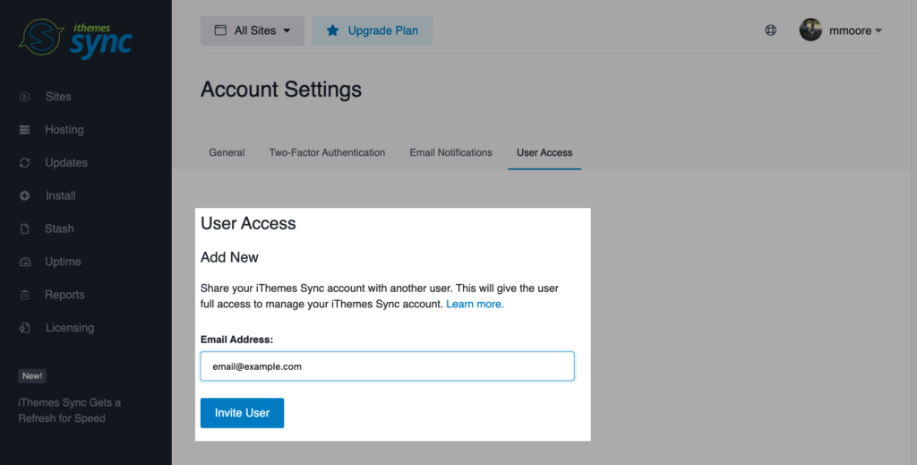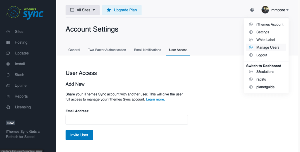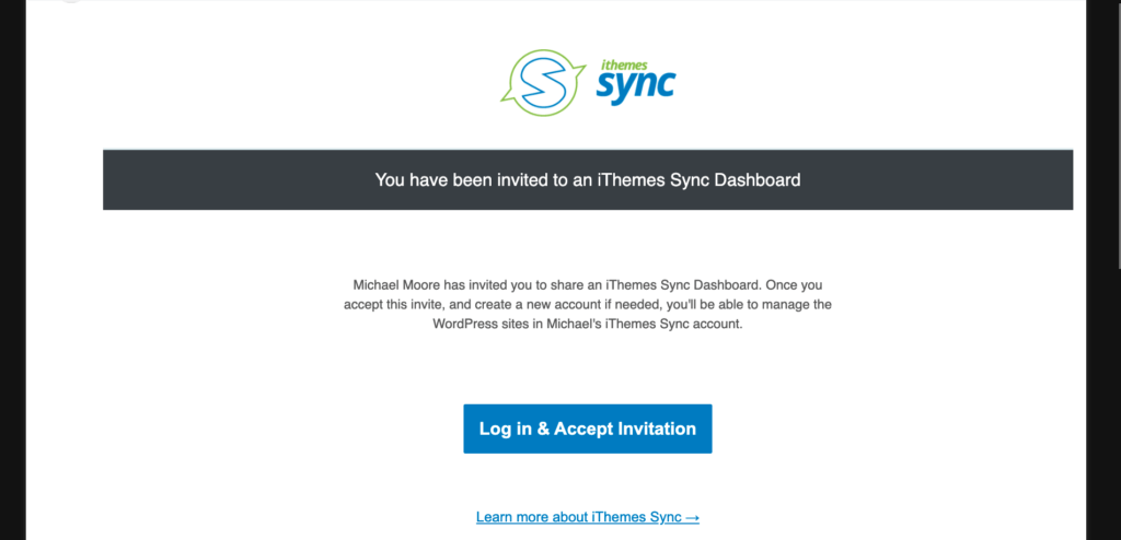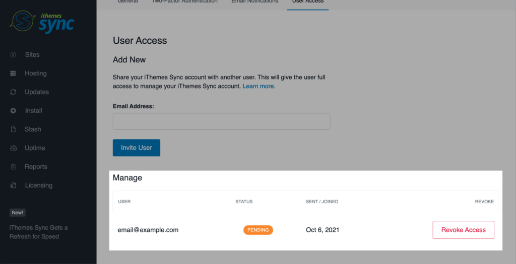 Note: By inviting a user to access your account, you give full administrator access to your iThemes Sync account and any sites you have synced.