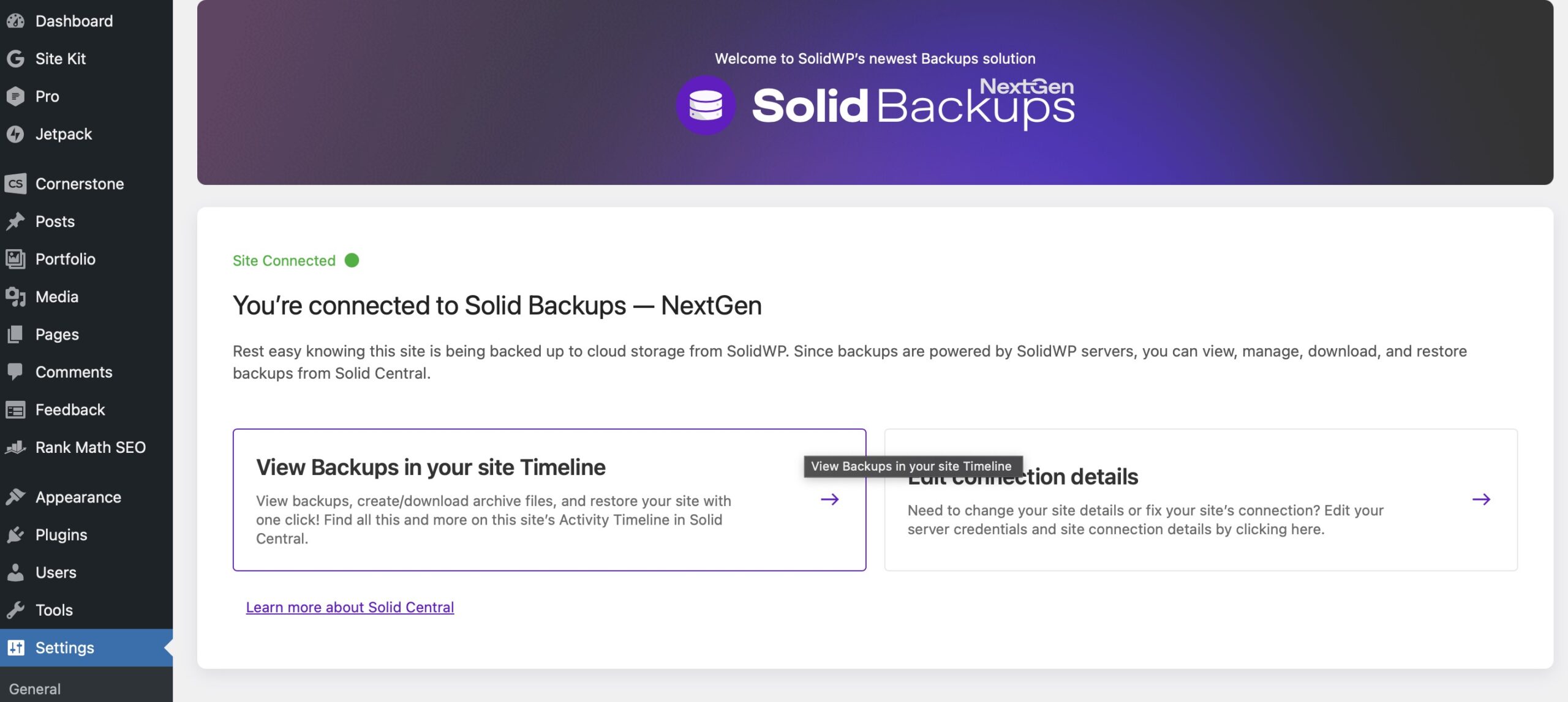 When logged into a site’s WordPress admin backend, you can verify the connection status directly by going to Settings > Solid Backups: