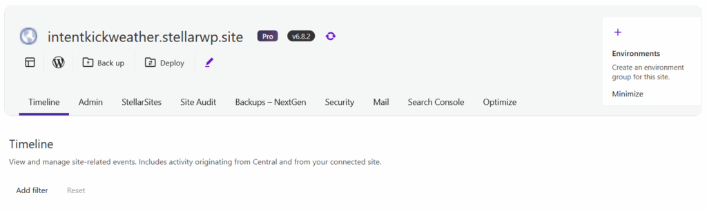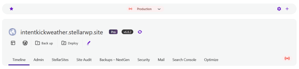 Once you click into a primary environment from the list of sites, you will then see the Environments Switcher at the top of the page, which will display the currently selected environment. The “star” icon clearly identifies this environment as the primary, and icons to manage and add environments are present to the right of the switcher.