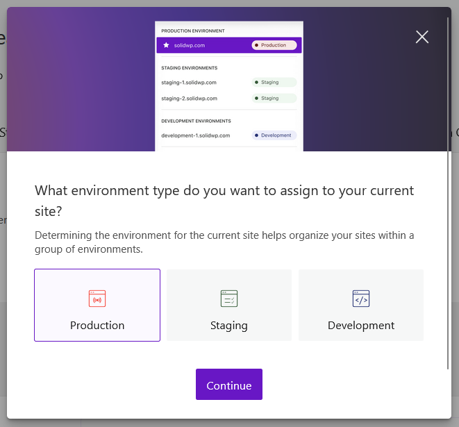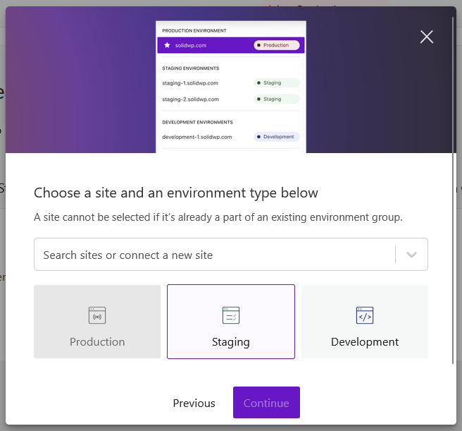 Using the field provided, select or search for a site to add as the next environment in the group, then select the type of environment you wish to add. If there is already a Production site in the group, this option will be disabled, leaving the Staging or Development options available. You can add multiple Staging or Development environments to a group, but only one Production.