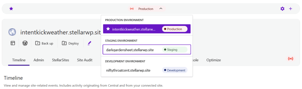 Selecting a different site from the list will immediately update the contents of the page to reflect the new environment you have selected, allowing you to quickly switch between the different environments with ease.