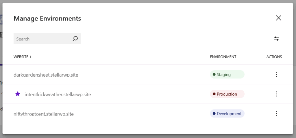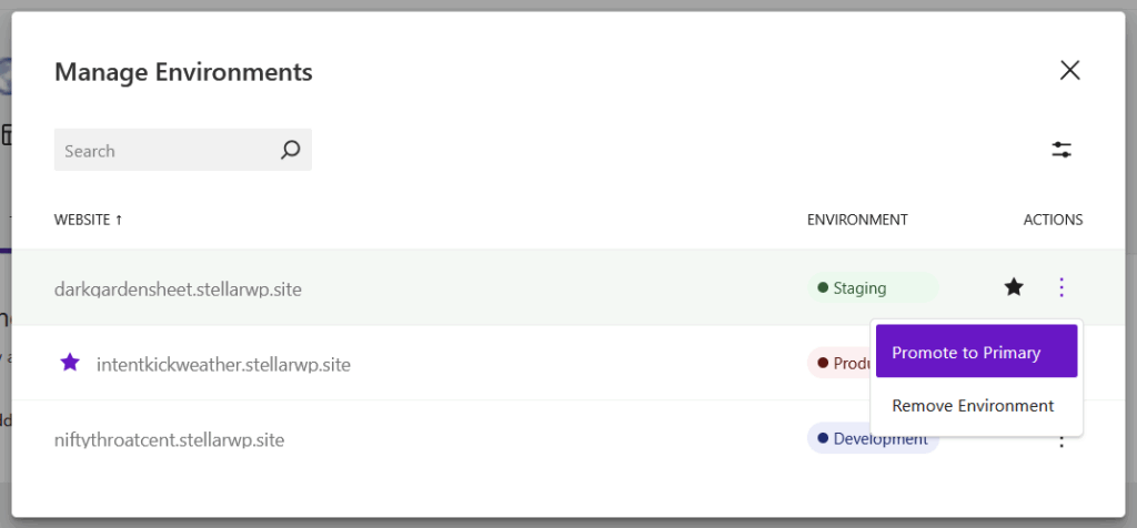You will then be presented with a list of all the environments in current group, with the primary clearly marked with a star icon, with clear labeling to indicate what type of environment each one is. You can also use a free text search to discover a specific environment you’re looking to manage, and you can change the way that the environments list is sorted/presented using the settings icon.