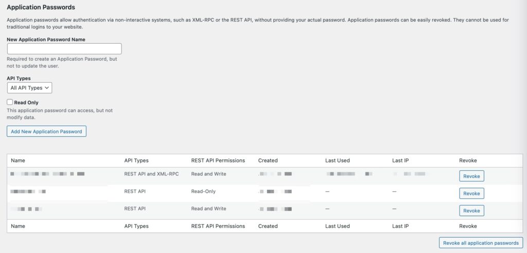 Introduced in WordPress 5.6, Application Passwords offer a secure way for external services to communicate with your WordPress website. In contrast to traditional passwords, application passwords are unique, site-specific, and associated with a particular user account.  These passwords are generated through the WordPress user profile interface and can be used to authenticate API requests without the need to use your primary WordPress account password.