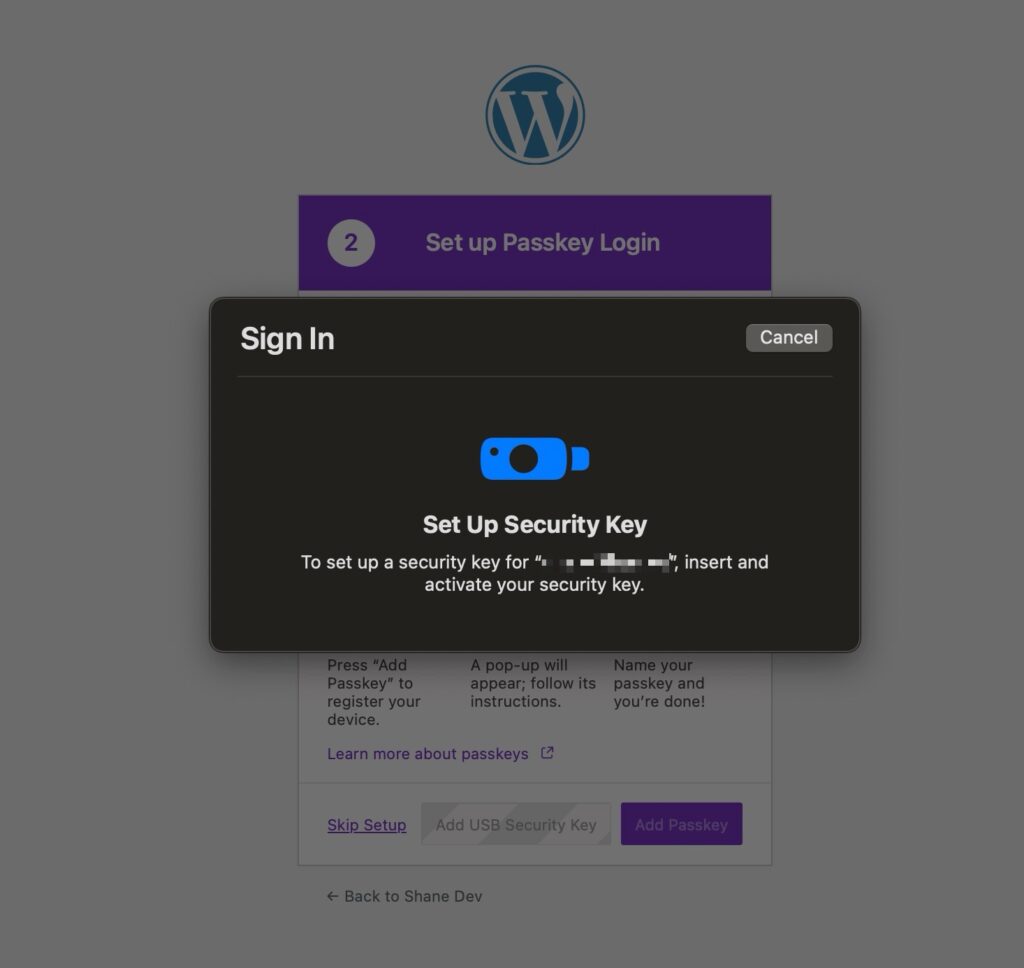 When you’ve configured your Solid Security Pro plugin to activate Passkeys for select user groups, those users will be greeted by the “Set up Passkey Login” prompt the next time they log into the site.