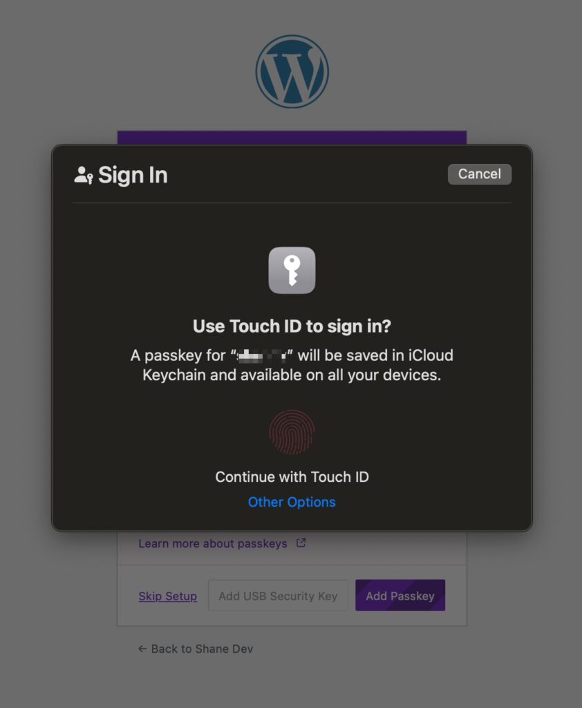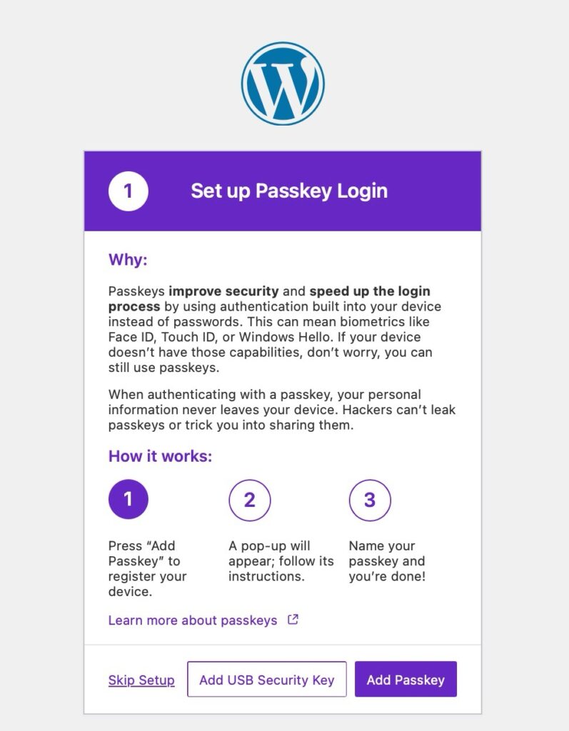 Passkeys are the most secure way to log into your WordPress websites. Passkeys use public-key cryptography, where a public and private key pair is generated on your device (a computer or phone, or even a dedicated cryptography device). The private key, which verifies your identity, stays on your device and is never shared. The public key is stored on your website’s server. When logging in, the website sends a challenge to your device. Your device responds and “signs” it with the private key, proving your identity without ever revealing your credentials.