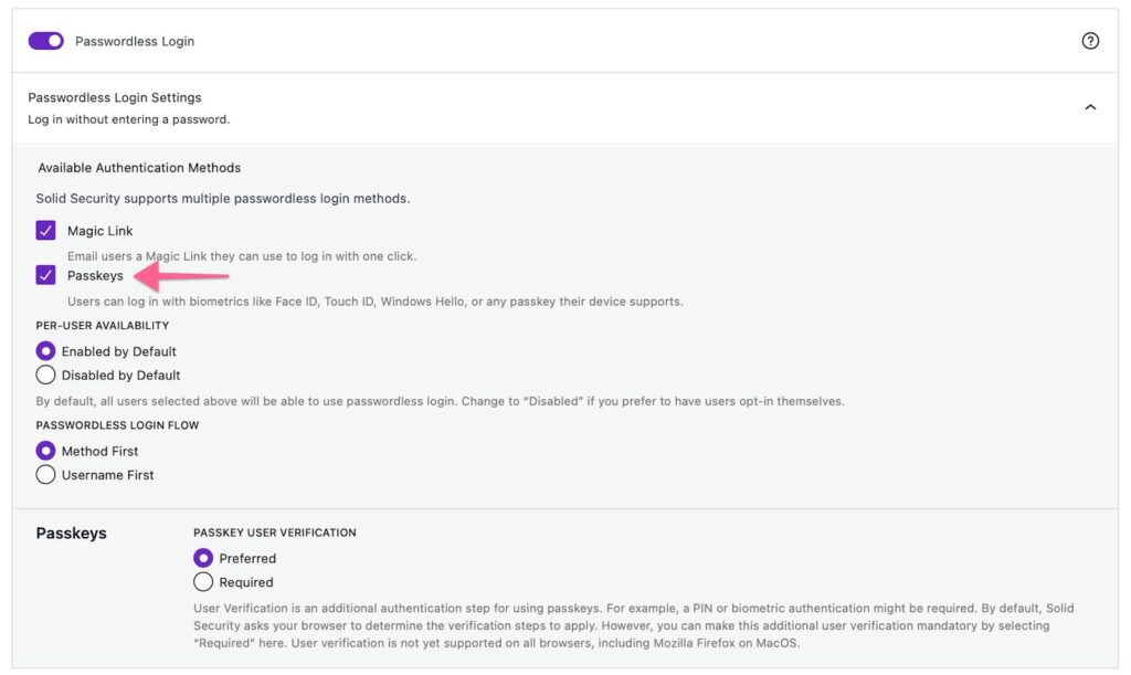 Finally, passkeys are the best way to provide the most secure login method available for your WordPress site. Both website admins and end users, like customers, can start using passkeys to log in to any WordPress site running Solid Security Pro.