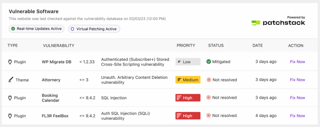 Patchstack’s team is constantly monitoring and patching vulnerabilities in the hundreds of thousands of products built around the WordPress ecosystem, and you’ll see their Patchstack Priority score next to each identified vulnerability, helping you understand the real-world risk it presents to your site. You can deep-dive directly from this card into that detailed report.