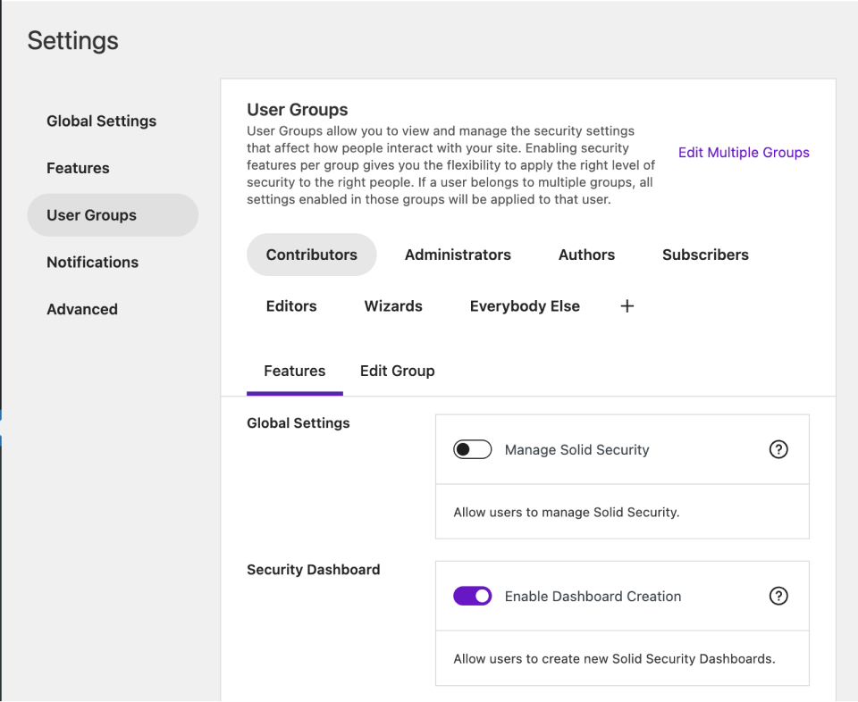 Access to security information and the ability to modify security settings for your site is not every user’s job. That fact is baked into the default settings of Solid Security. During onboarding you’re able to select the users or user groups who you want to have access to security settings, and to be able to create additional dashboards.