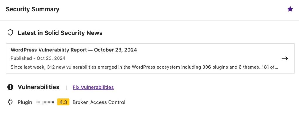 The Security Summary card shows an overview of the latest Solid Security News pulled from the feed here at solidwp.com. This allows you to navigate quickly to a deep dive into WordPress vulnerabilities, curated by the SolidWP team with immense amounts of help from the folks at Patchstack.