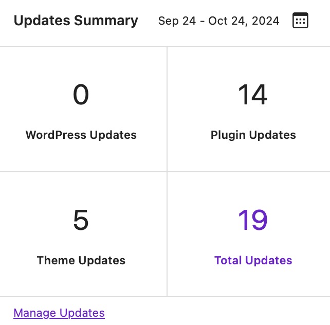 The Updates Summary card provides the summary of all updates made on the site’s WordPress core, plugins, and themes within a specific timeframe. This card is essential for keeping track of update activity. By reviewing this card, you can monitor whether updates are happening regularly or if there are gaps in the update activity, as it is important to ensure all WP components are running their latest versions to mitigate vulnerabilities.