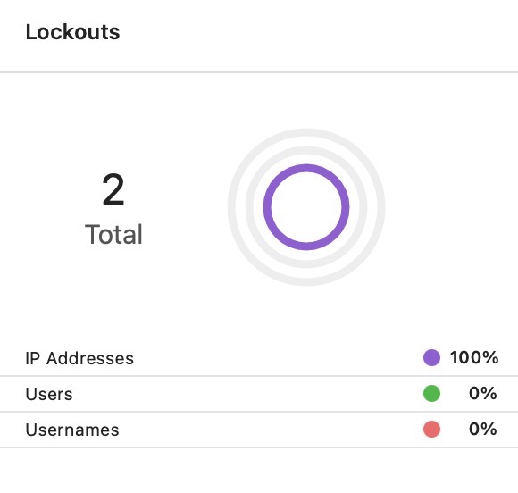The Lockouts card gives you an overview of lockout events made on the site over the past 30 days. It displays the total number of recorded site lockouts and a breakdown of the source of the attempted logins. This card is useful for understanding where the site lockouts are occurring which can help you implement additional security measures such as implementing stricter login policies, if necessary.