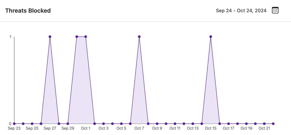 The Threats Blocked card displays a graph of the overall number of threats Solid Security has blocked on the site. The events displayed are data coming from these modules: Local Brute Force, Network Brute Force, and Firewall Rules Engine. This lets you quickly assess the effectiveness of your security configurations and identify which periods had increased activity.
