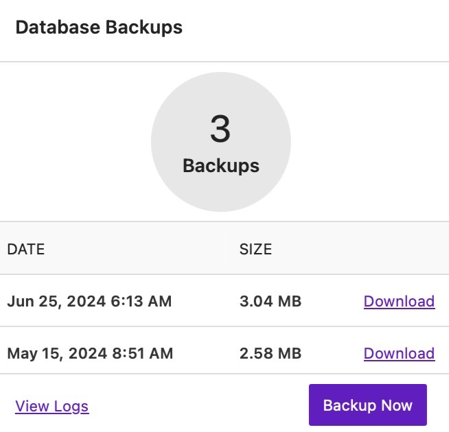 The Database Backups card lets you create a database backup of the site and lists all the backups you’ve created. The number of backups listed will be based on the limit you’ve set on the “BACKUPS TO RETAIN” setting in Security -> Settings -> Features -> Utilities -> Database Backups.