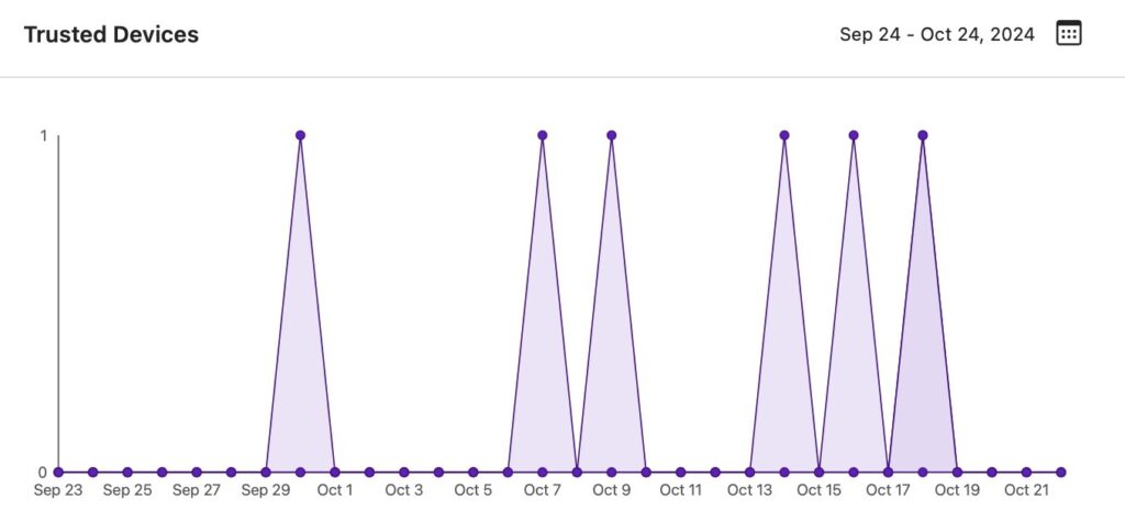 The Trusted Devices card displays a graph of device activity on your site, categorizing devices as Approved, Auto-Approved, or Blocked. This card lets you regularly monitor how devices interact with your site, help detect unauthorized devices, and lets you identify that only trusted devices are gaining access.