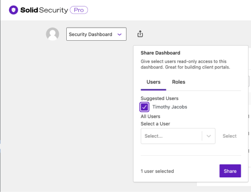 Solid Security Pro gives you the ability to share a read-only view of the Dashboard to specific users. This is an excellent way to share security insights with clients or team members without granting them access to make changes.