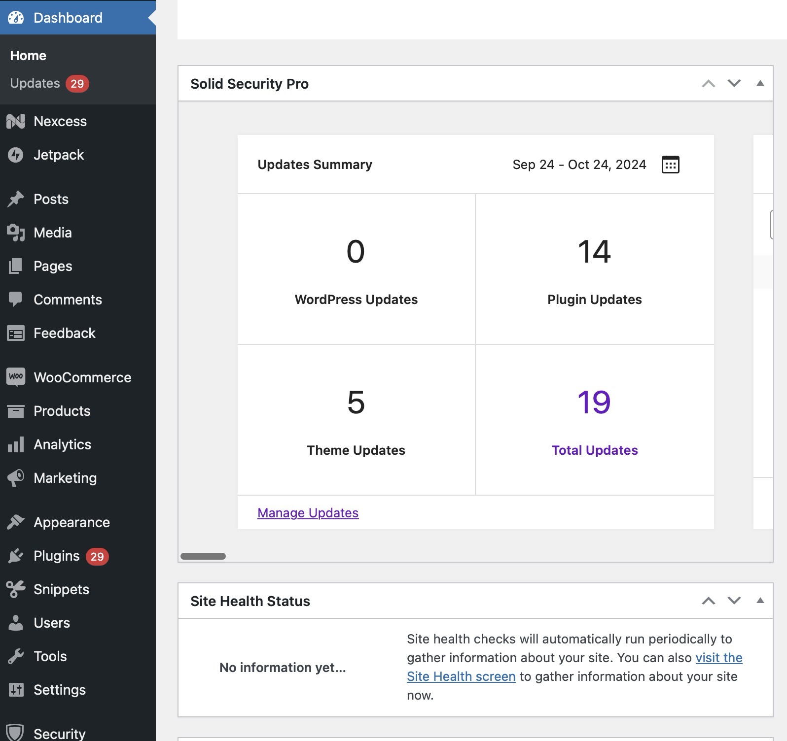 When using Solid Security Pro, a WordPress Dashboard widget is automatically added. This provides at-a-glance data from the Security Dashboard directly within the WordPress admin area. This lets you quickly assess the security status of your website without needing to navigate to the main Security Dashboard. You can also use the action buttons of each Security Card there to perform security actions.