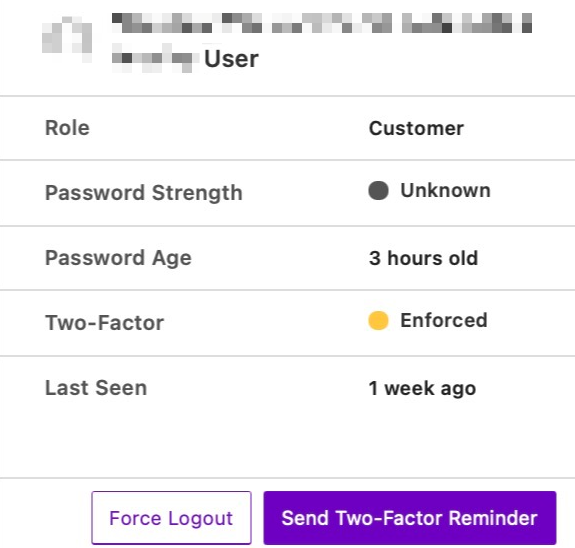 The User Security Profile card works the same as the User Security Profiles card but it lets you pin an individual user, displaying the same security information with an added functionality of sending a Two-Factor Reminder email to that user (if the user hasn’t configured 2FA yet).