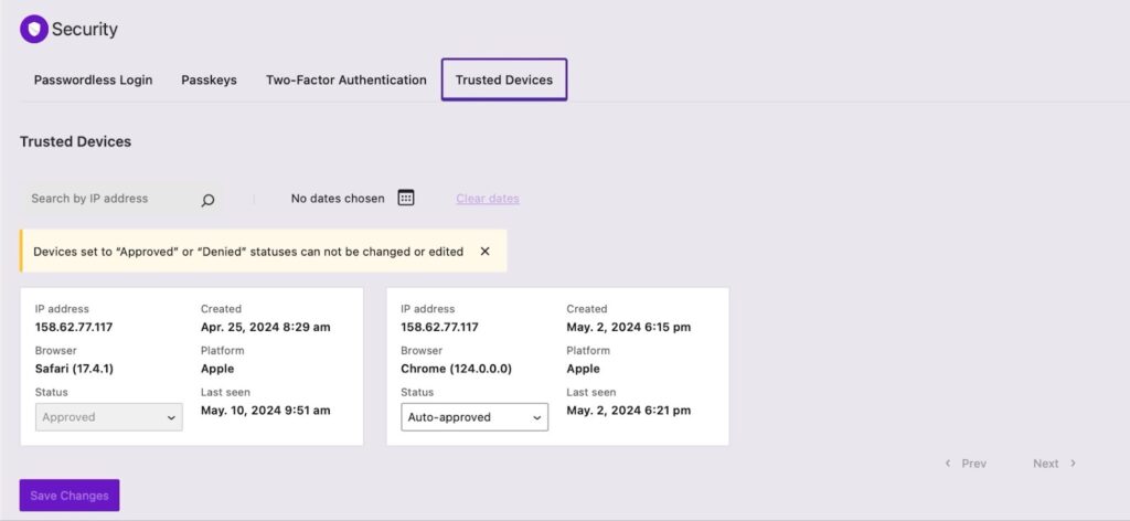 If a device is marked as “Pending”, you can update it to either “Approved” or “Denied”. But once a device is approved/denied, the status cannot be changed. Solid Security can also auto-approve a device if it recognizes it as similar enough to an existing trusted device.