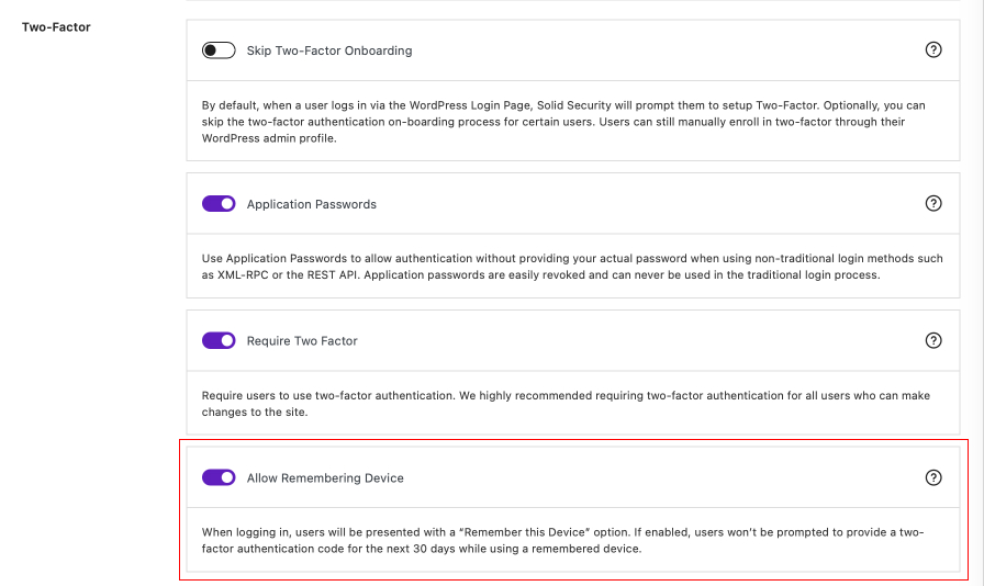 Note: While remembering devices is convenient, it is more secure to require users to enter a new Two-Factor token each time they log in.