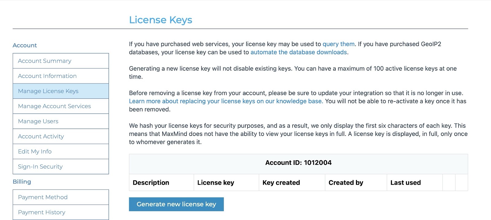 6) Login to your account. On the left-hand side of the screen, click Manage License Keys and click the Generate new license key button.