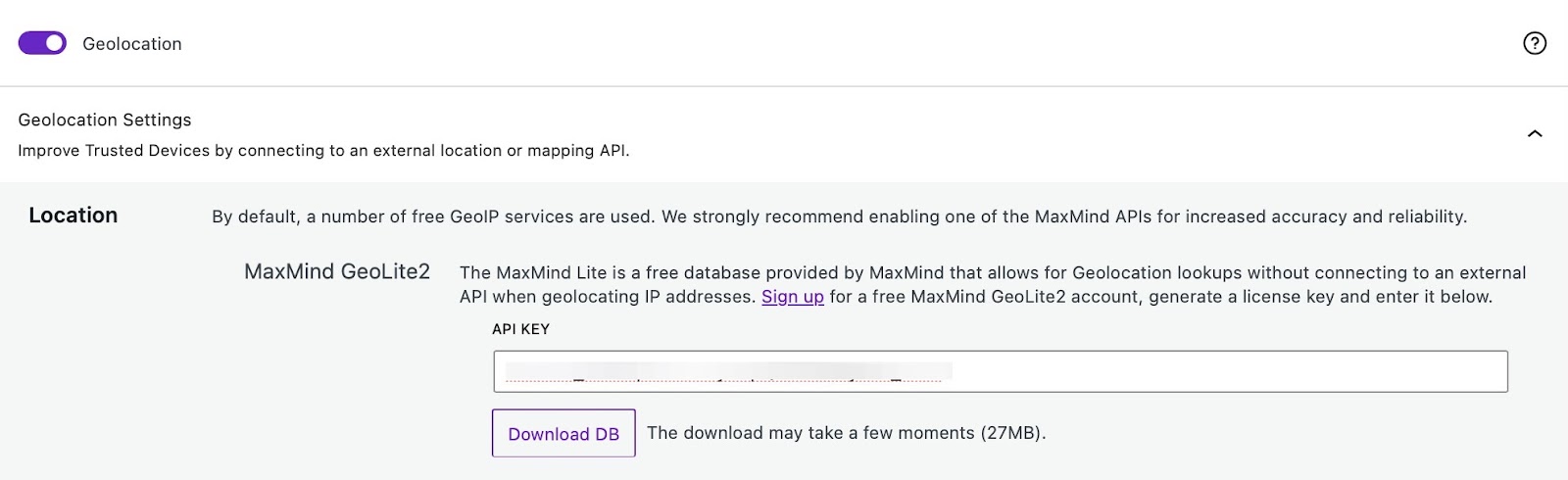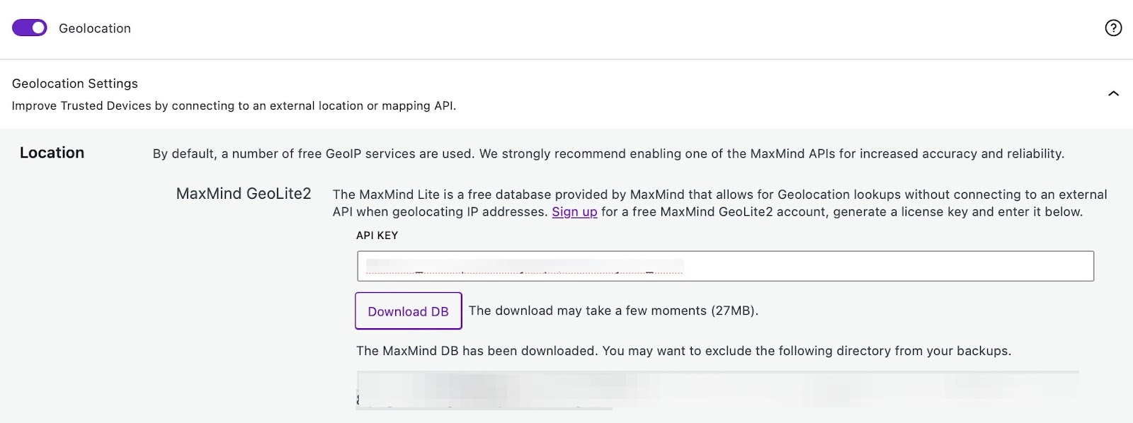 9) Return to your site, and go to the Geolocation settings. Paste your key, and click Download DB.