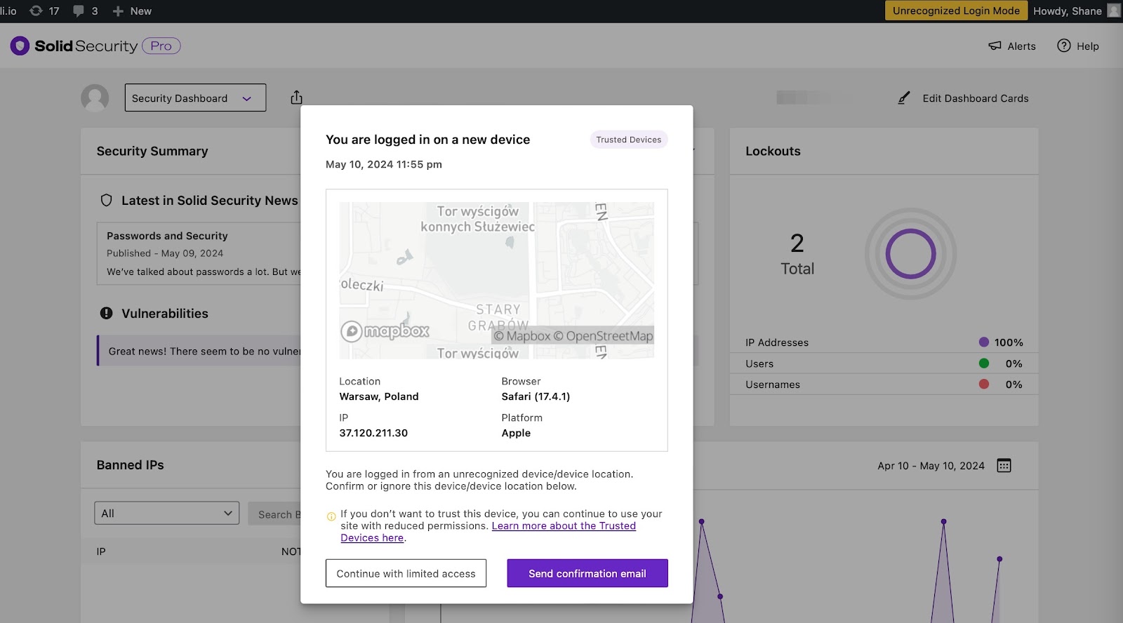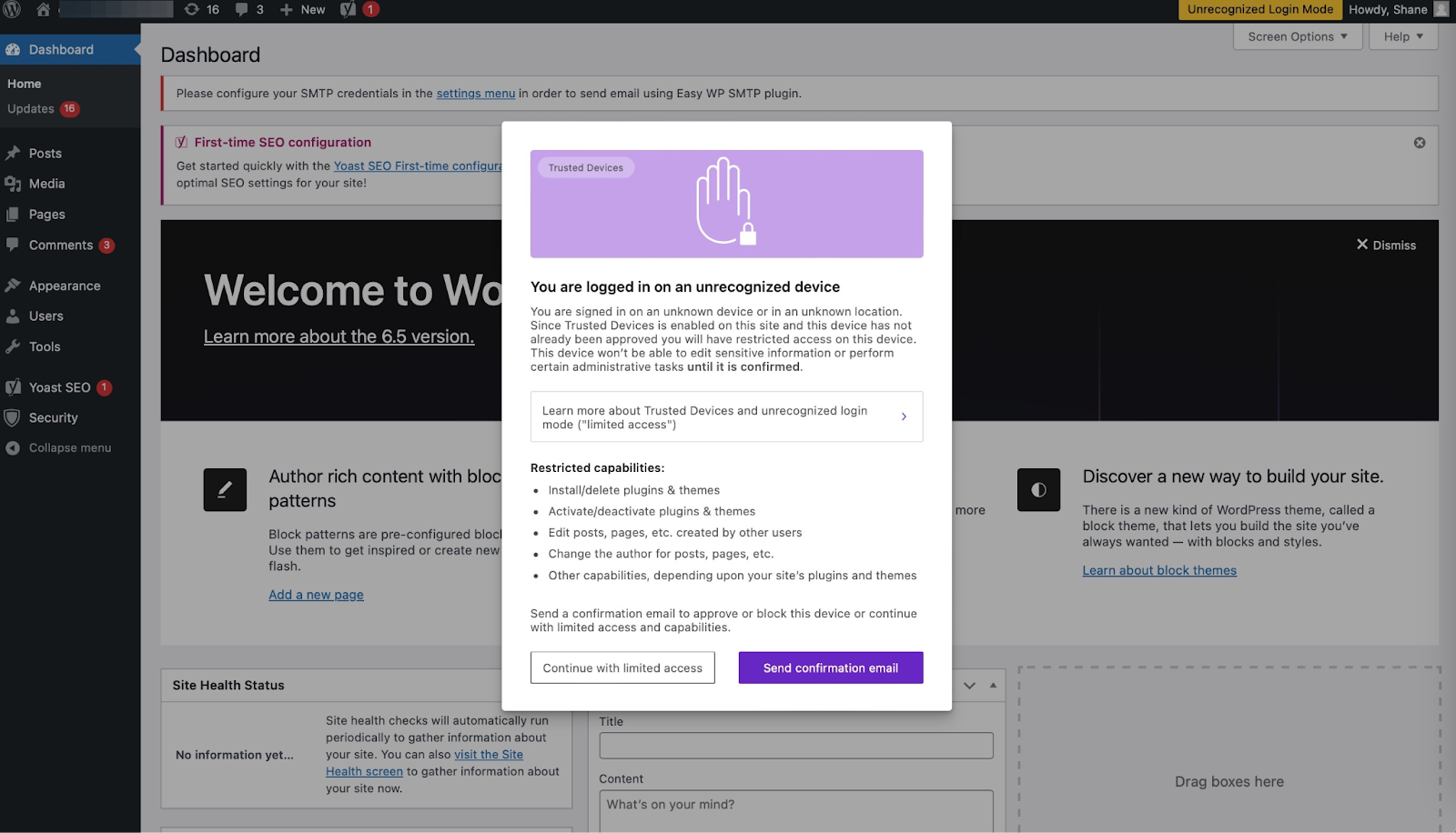 When you’re logged-in on an unrecognized device and Restrict Capabilities is enabled, you will see a prompt from Solid Security informing you that you’re currently in Unrecognized Login Mode.