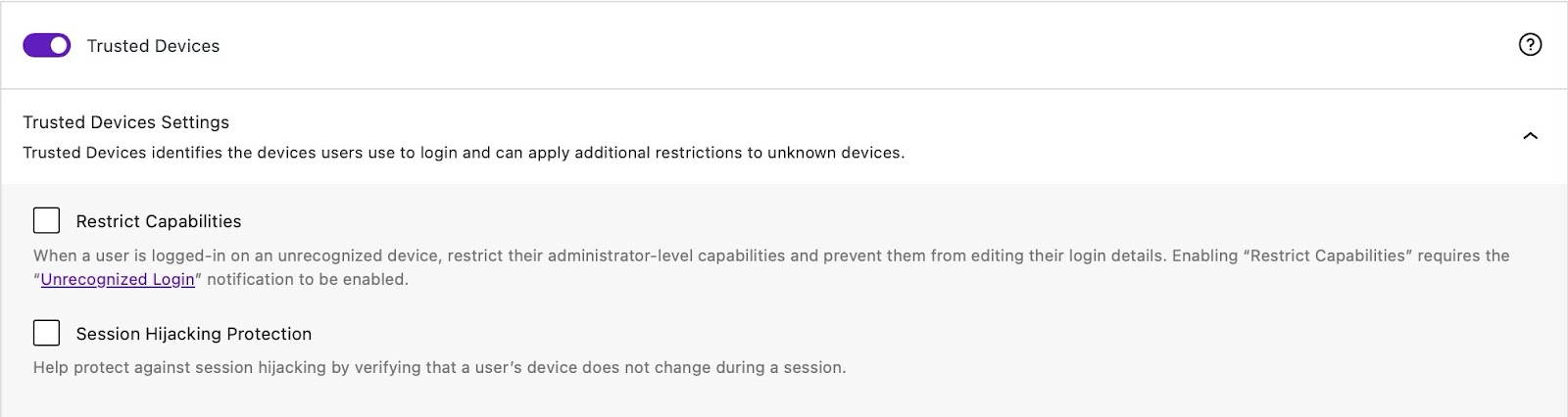 - Restrict Capabilities — This lets you restrict a user’s administrator-level capabilities and prevent them from editing their login details, when they are logged in on an unrecognized device.