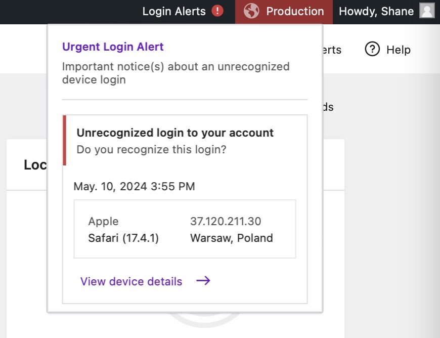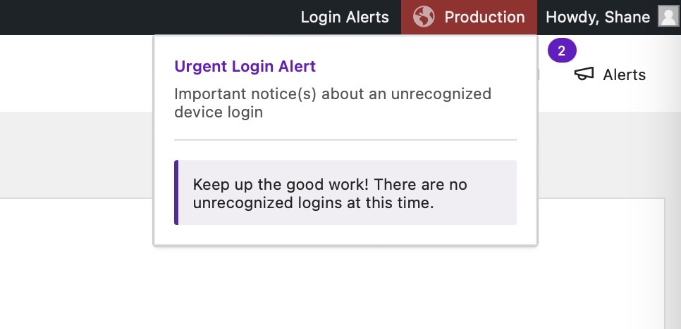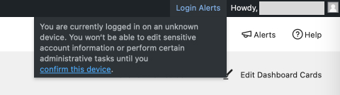 After enabling the Trusted Devices module, administrators will see a Login Alerts tab in the WordPress admin bar with pending unrecognized devices.