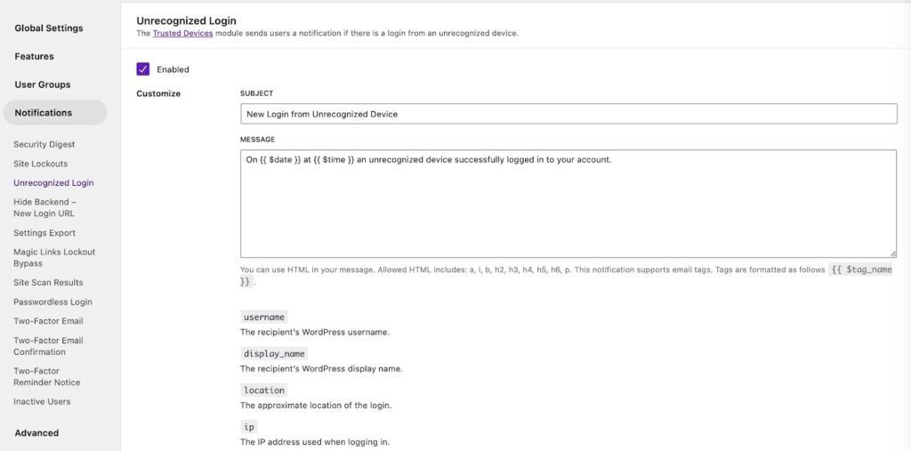 - Note: This requires the “Unrecognized Login” email notification to be enabled within the Solid Security Notifications.